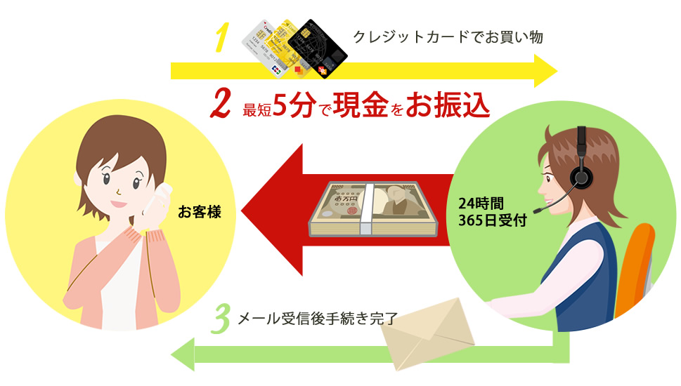 申し込みからクレジットカード決済が完了した後、銀行や時間による制限なく原則24時間365日即日でご指定の銀行口座へ現金をお振込みいたします。